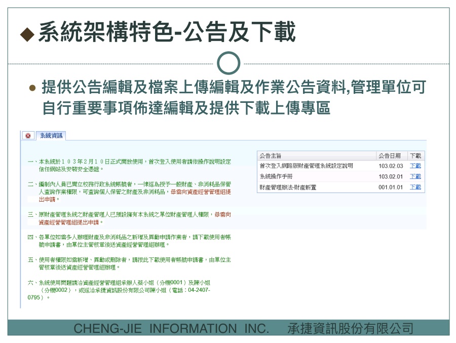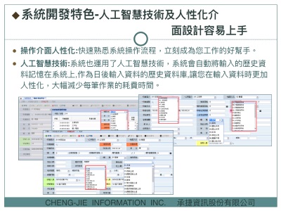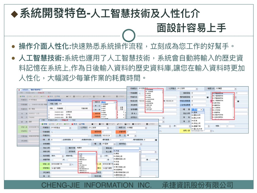 承捷公司多年來深耕於政府機關經營有關財物管理相關管理系統, 所有員工均具有公務機關資訊推動實務經驗, 從 95 年開始承接政府機關財物管理相關系統專案開發,市場佔有率高, 並於 102 年開始涉及農產品外銷出口、禽肉電宰、蛋品食安相關產品之溯源流程整合規劃設計。